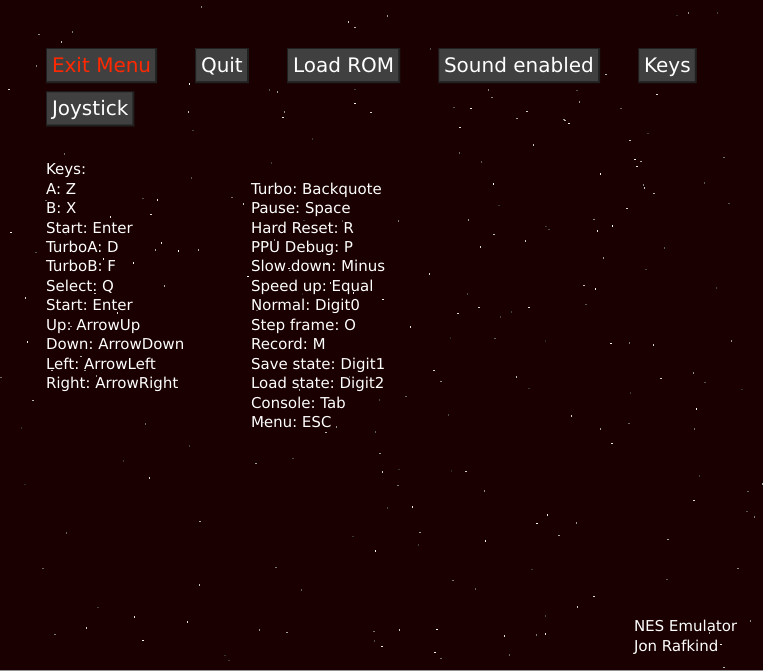 NES Emulator. Drag an drop a .NES file onto the black screen (while not in the menu) to load it.